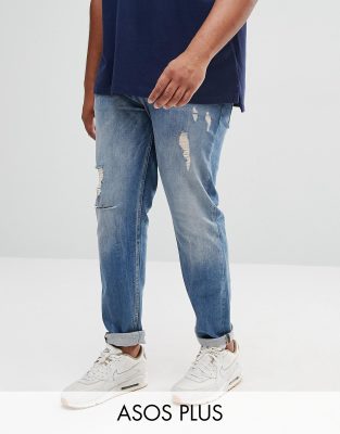 ASOS PLUS Stretch Slim In Mid Blue With Rips & Abrasions